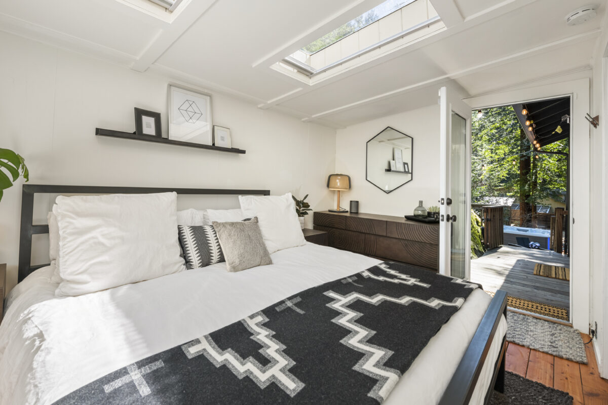 Dark exterior walls—with doors and windows trimmed in white—become the late 1950s dwelling, allowing it to blend with the forested setting. Interiors are warmed by stained-wood ceilings, while white walls and plenty of windows allow the dense redwoods to work their scenic magic. Skylights brighten the home all the way up to the rafters and offer a different perspective of the towering redwoods. Deep-hued cabinets, updated light fixtures and rustic textiles are design details that make the space shine.