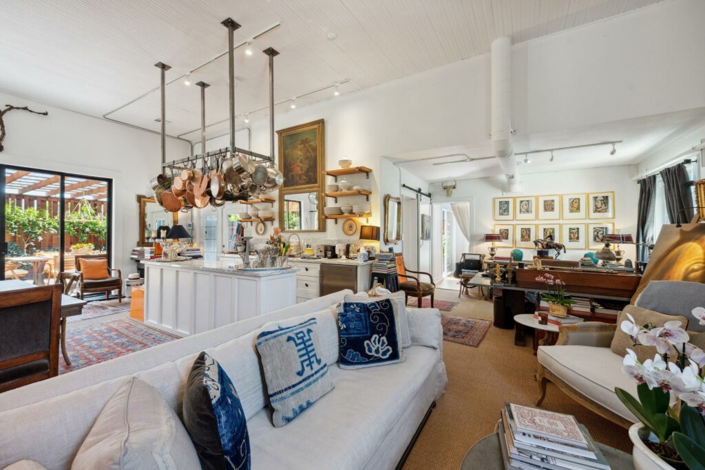 The one-bedroom, one-bath living space is layered in antique finds: a caddy of silverware sits like art on a marble counter, a reclaimed wooden arch is a striking showpiece in the sitting area, a grid of vintage prints defines the office nook. Off to the side is a covered patio surrounded by citrus trees, a large table to gather around, a pizza oven, and a sideboard enhanced by a symmetrical layout of more salvaged finds. Behind all this is a newly built barn with two bedrooms and three bathrooms.