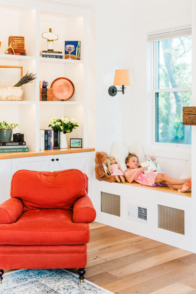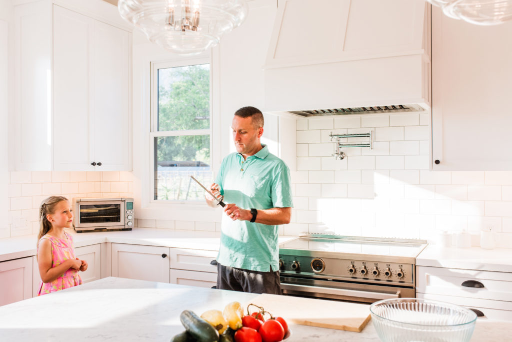 It’s an easy-living home, one where the sliding window wall in the living room often remains open all day while Alba and Abhainn build massive pillow forts or have ice cream at the bar table at the passthrough. Greg can pull the kids into a late afternoon pizza project, helping them roll out dough on the kitchen island, then baking the pizzas on the grill out back. “We went in on a third of a cow with some friends, so we’ve also been eating a lot of steak.