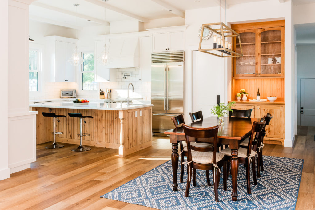 Their former home had been a two-story brick Colonial. But the new home Moseley designed has a traditional farmhouse look, sitting lightly on the land next to the carriage house and barn. A large great room with a sliding glass wall out to the deck connects to the open kitchen, which has a pass-through window to an outside bar table. “The thing that we love about the farmhouse is that it’s timeless,” says Greg. “And the finishes are timeless, like the subway tile. It doesn’t look bad in houses from a hundred years ago, and it won’t look bad in this house a hundred years from now.”