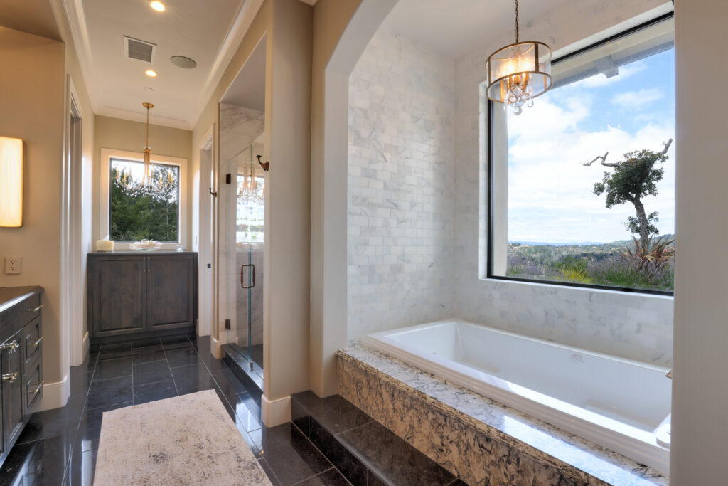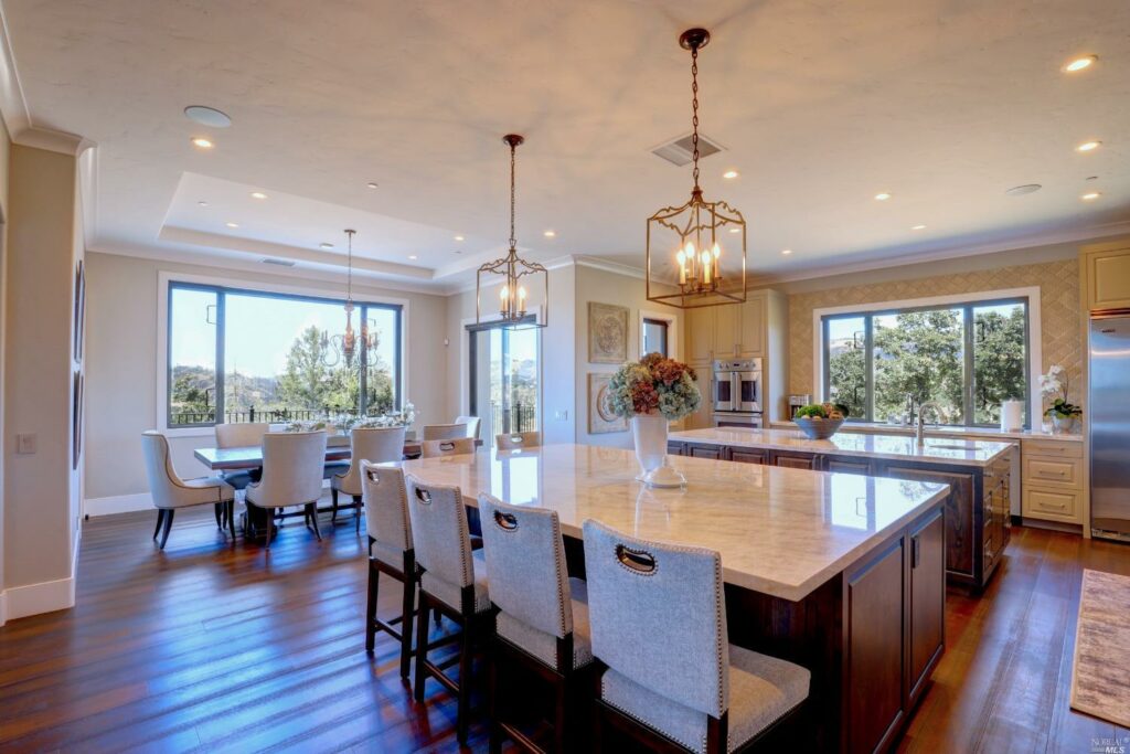 A pair of quartz-topped kitchen islands are attractive spots for food preparation on one side, and staging and dining on the other. Floor-to-ceiling windows that pocket into the walls capitalize on the views of this top-of-the-hill lot. Barnes credits architect Farrell Faber for positioning the home so skillfully that views are accessible from every room.
