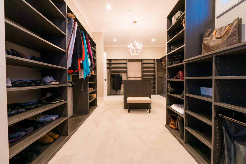 Recessed ceilings add architectural interest, and details like chandeliers cap off the look in every room. Even the main bathroom’s bathtub has an overhead chandelier — a witty choice in brass with a modern drum mesh shade surrounding the ornate fixture. The traditional design has just enough contemporary elements, such as clean-lined trims and select modern furniture pieces, to keep it fresh