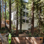 The open staircase with windows and skylights connects the levels and provides a well of light and views that emphasize the home’s height alongside the towering trees.