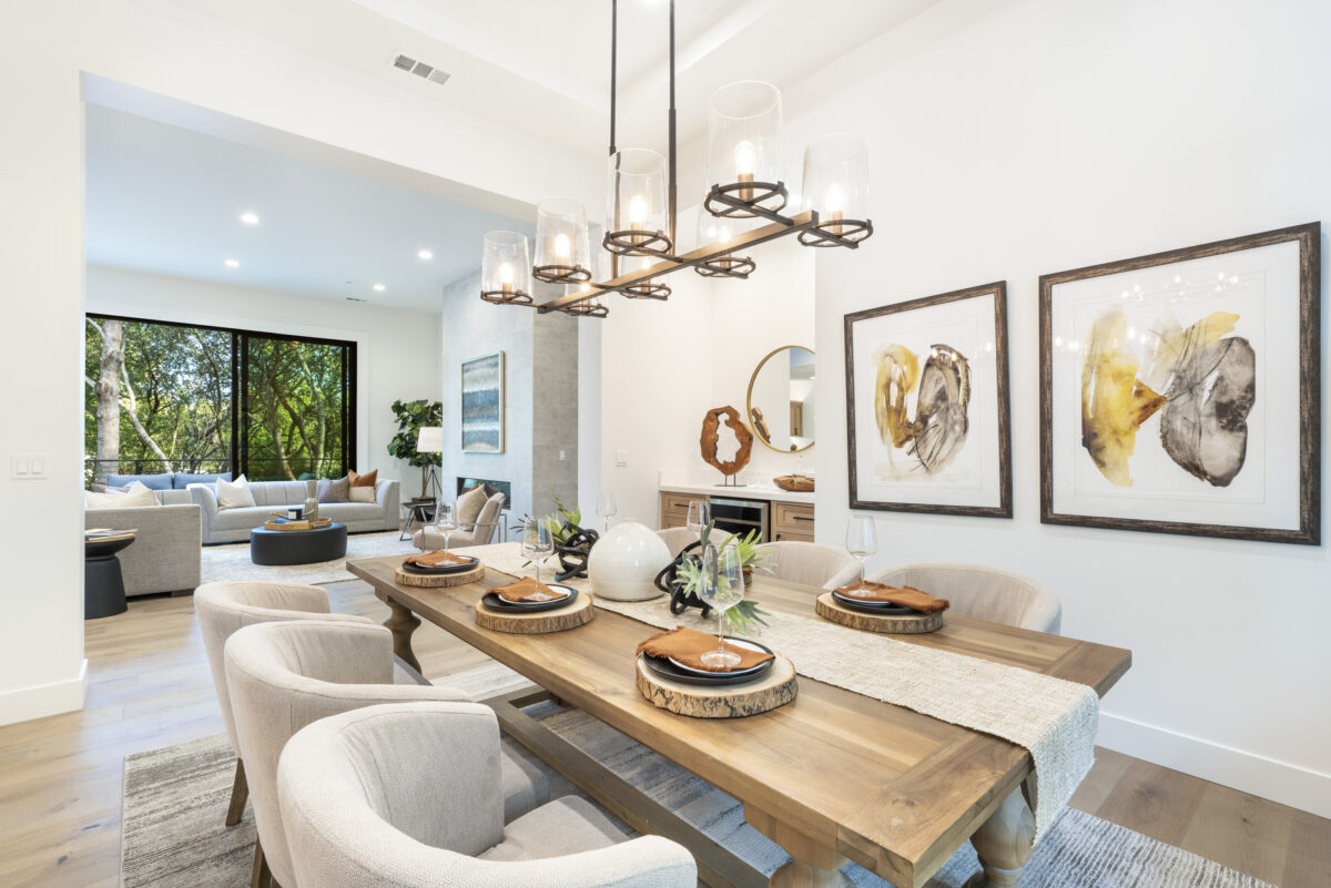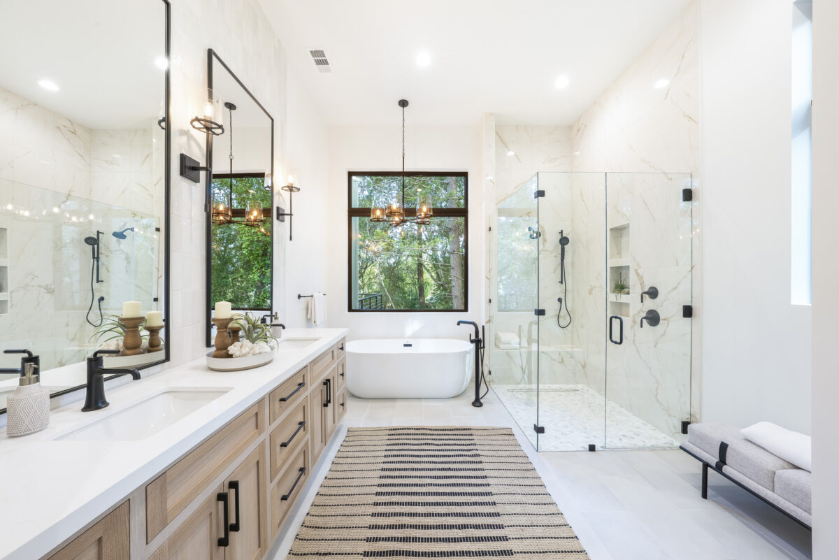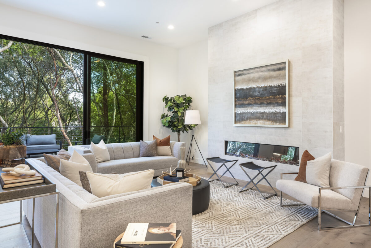 Wide plank floors throughout set the stage for relaxed Wine Country living. The home has a feeling of openness thanks to high ceilings, a great room, and large picture windows showcasing the surrounding trees. A linear fireplace brings warmth and modernity to the living room. A tranquil palette of whites and woods with black accents keeps the aesthetic calm and casual, yet elegant.