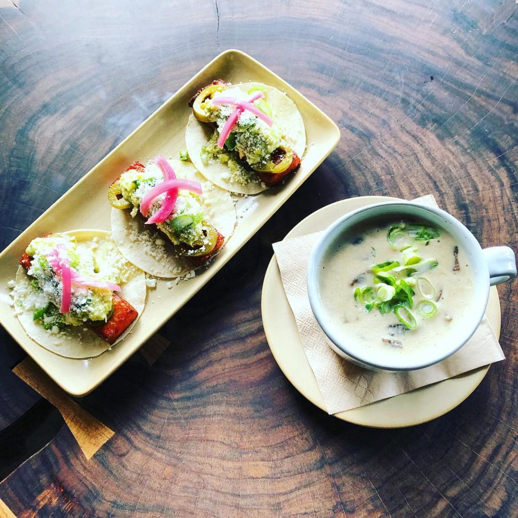 Chickpea sweet potato fritter tacos with house made tomatillo salsa and pickled jalapeños, and a cup of creamy cashew mushroom soup at Whisper Sisters in Petaluma. (Courtesy photo)