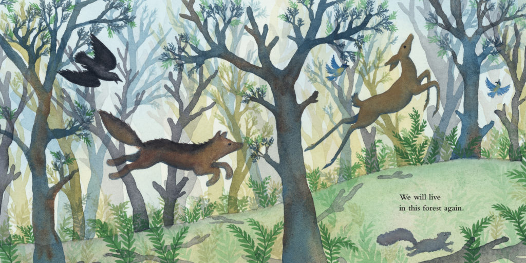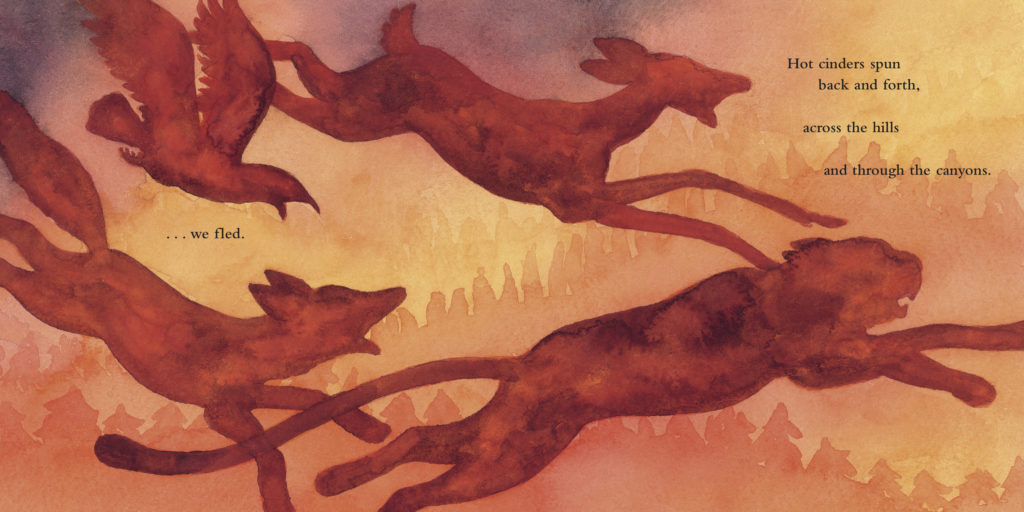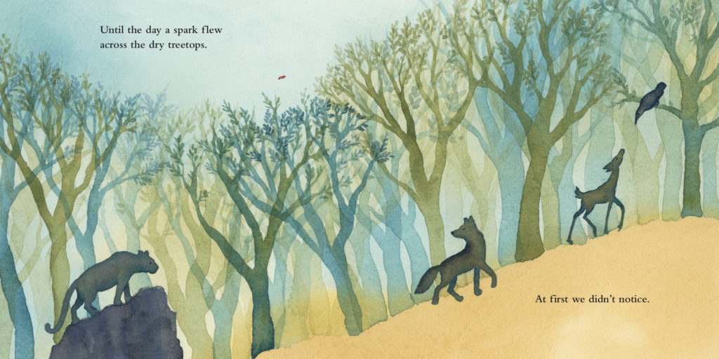 The story is gently told with simple, reassuring language to read aloud together and colorful, finely wrought watercolor illustrations. Marino has also chosen to add a personal essay and information at the back of the book for parents who would like to explore the topic of wildfire and resilience more deeply. “This is a time full of learning and change, and we wanted that extra information there to show that,” Marino explains.