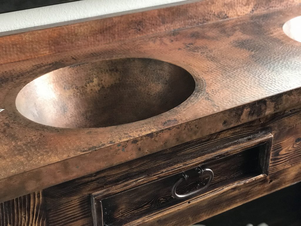 In between customer visits, Martinez can now be found on the patio outside his store where he cuts wood with the help of an assistant and works on new furniture pieces, which can be customized using different materials — a wood vanity in the store, for example, is topped with a stunning double sink made out of copper. Martinez uses mostly recycled wood for his furniture (98 percent of the wood is recycled) and slabs of wide and wavy-grained wood are finished with wax instead of shellac for outdoor use.