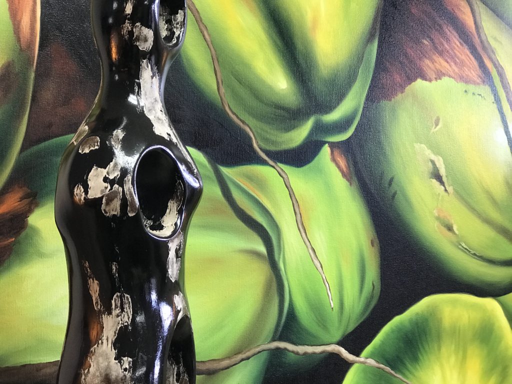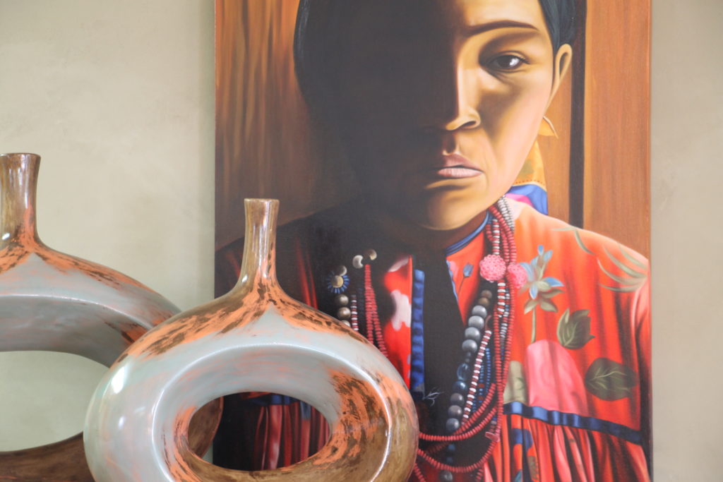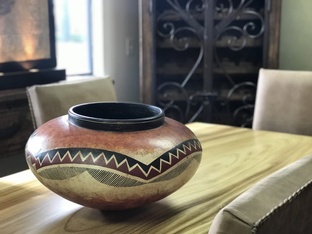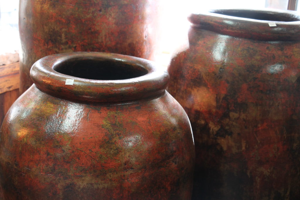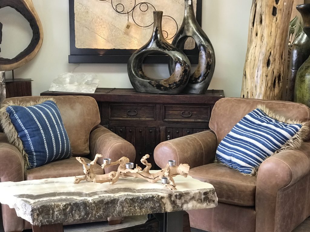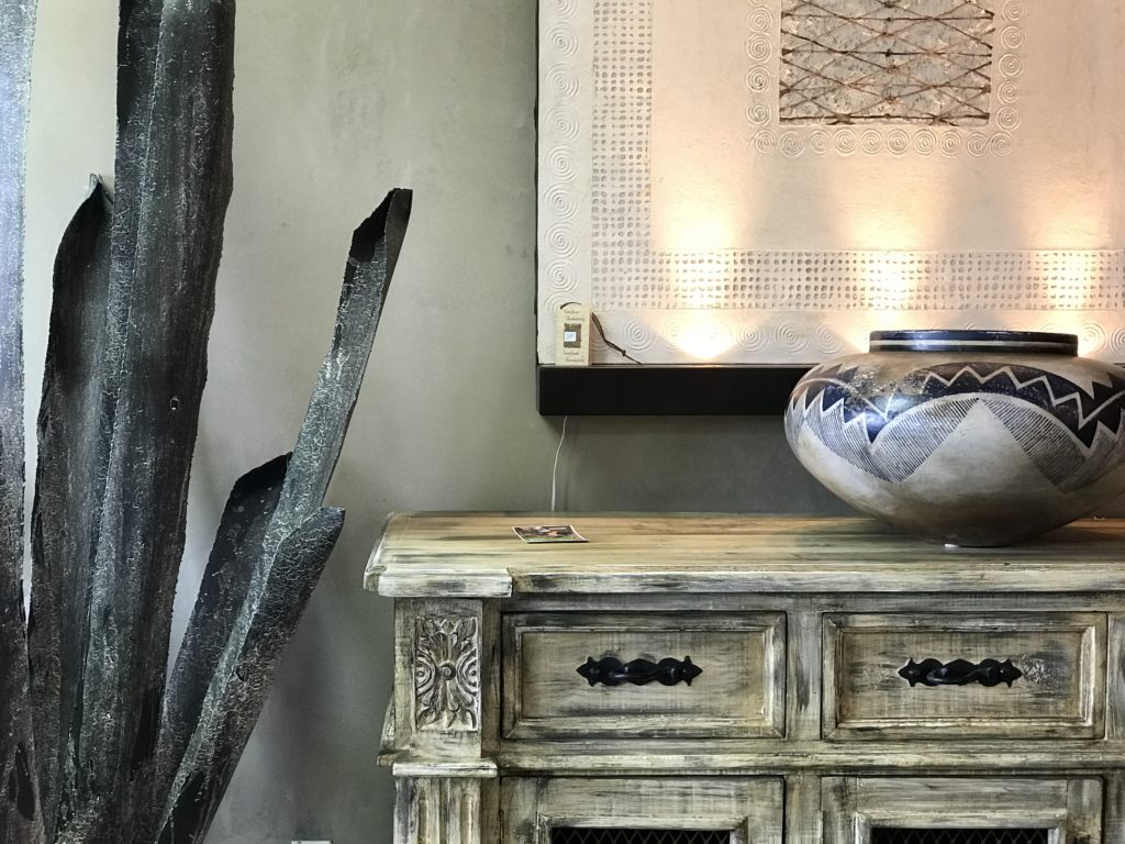 Martinez grew up in Mexico in a family of artists. His mother was a painter, his father made furniture and when Martinez was around 7, he began learning painting, pottery and woodcraft together with his 11 siblings. He’s been wanting to bring the furniture designs of Mexico to the United States for some time. In addition to his own furniture pieces, he now imports oversized terra cotta pots that he embellishes with paint, metal-framed mirrors which he paints to create a patinated look, as well as paintings, sculptures and other decor.
