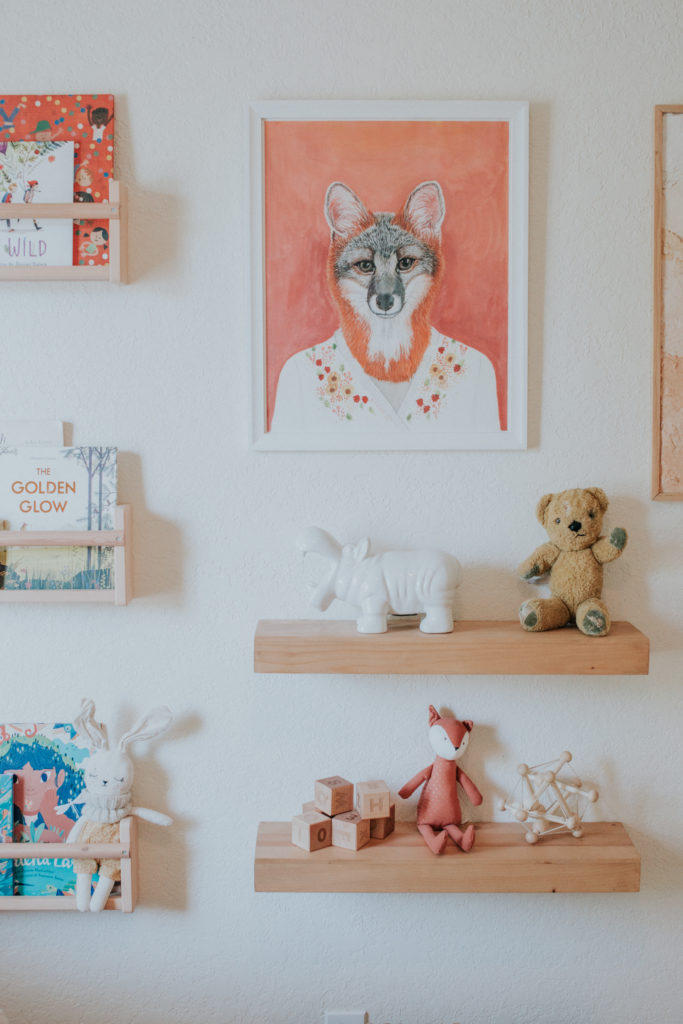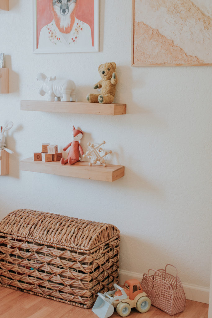 Dawkins likes to mix high-end items with budget buys and a little bit of vintage. “You just have to weave everything together and layer,” she advises. For her nursery at home, she purchased and placed the big items first — a birchwood crib, a white dresser (from IKEA) and a linen rocker. She then purchased shelves in blond woods from Target and many of the remaining items — baskets, poufs and linens — came from her own store. The room also features art from a local maker and pretty dried flowers by Design Em. “It doesn’t need to match,” says Dawkins about the decoration and suggests opting for mismatched but well-coordinated pieces of furniture and decor.