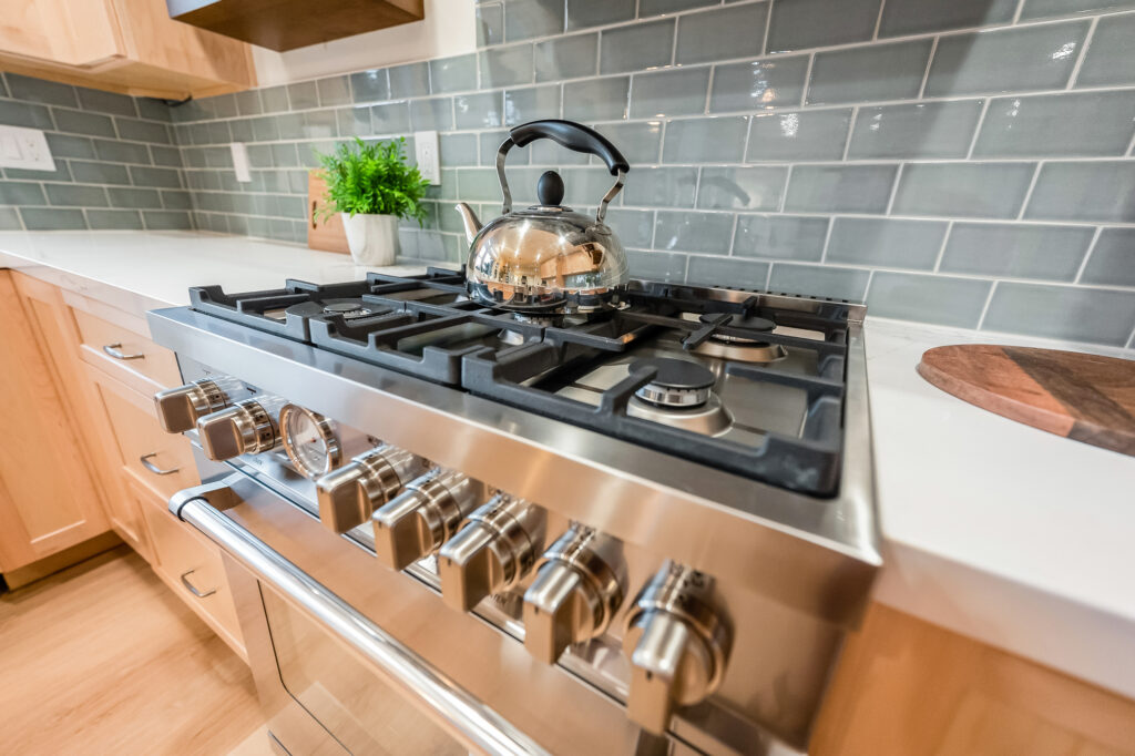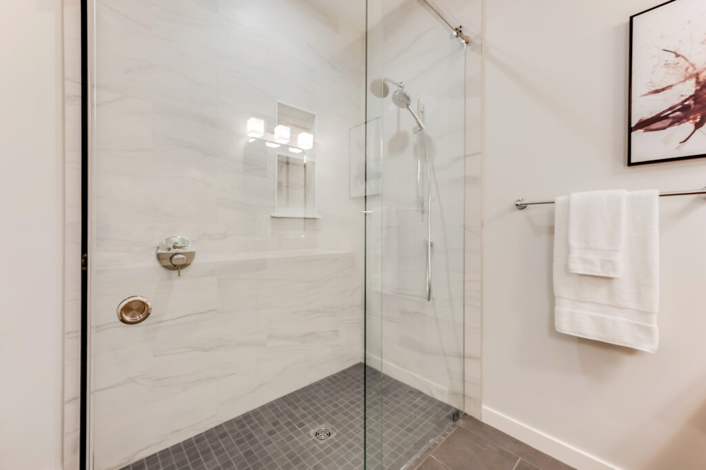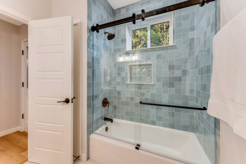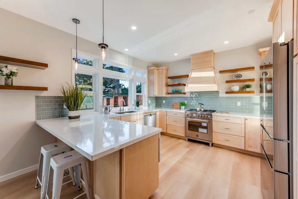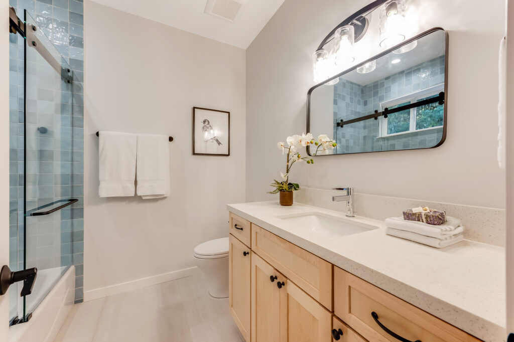 The 1400-square-foot dwelling is airy due to its open floor plan, with the kitchen and eating area adjoining the living room. Maple cabinets throughout the home add delicate warmth to the color scheme and tiles in grays, greens and blues enliven the palette with a freshness that seems to reference a seascape. The countertops are made of on-trend concrete.