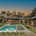The build is a series of single-gable structures in a U-shape around a courtyard with a pool and spa. The result is a grand and fresh take on modern farmhouse style. Wood slat siding adds distinct modernity while stone siding offers a traditional aesthetic.