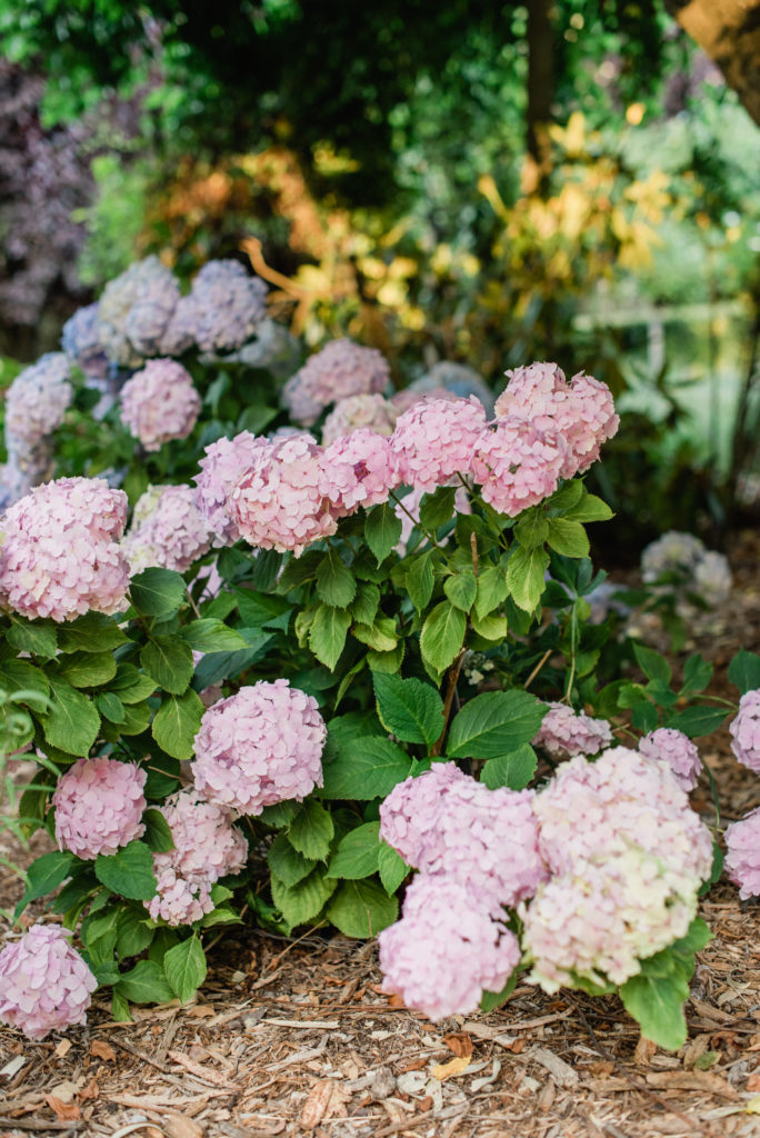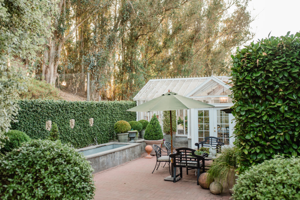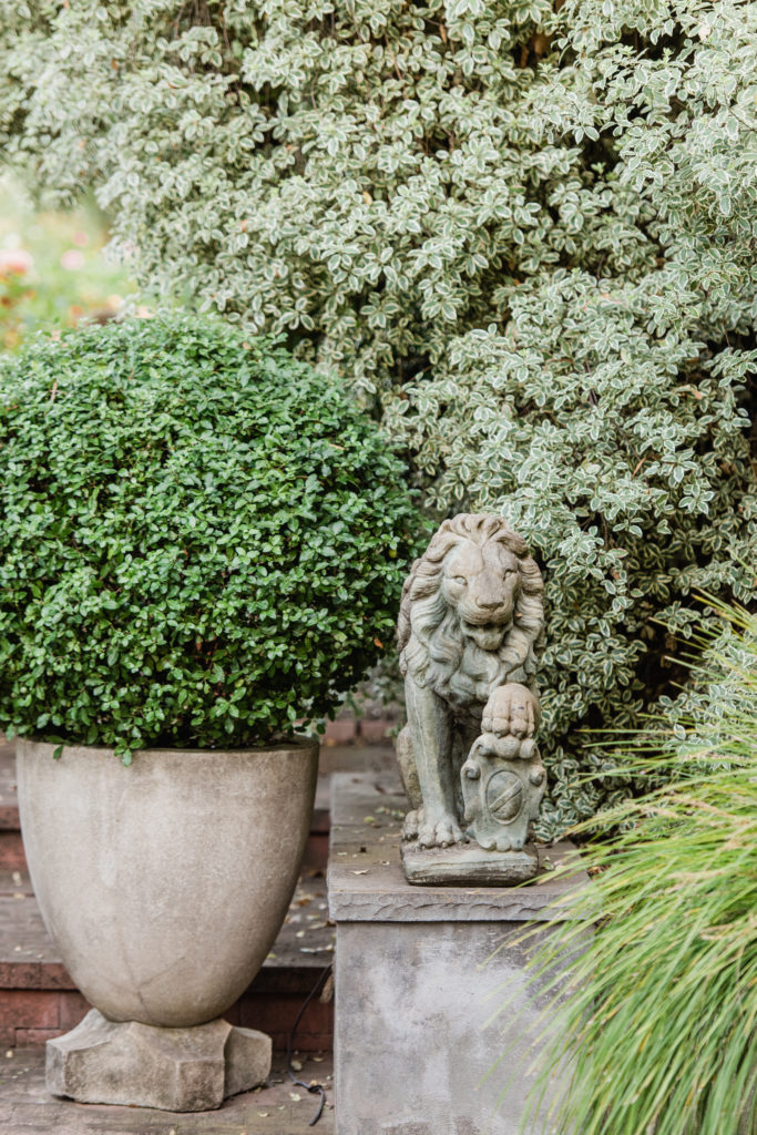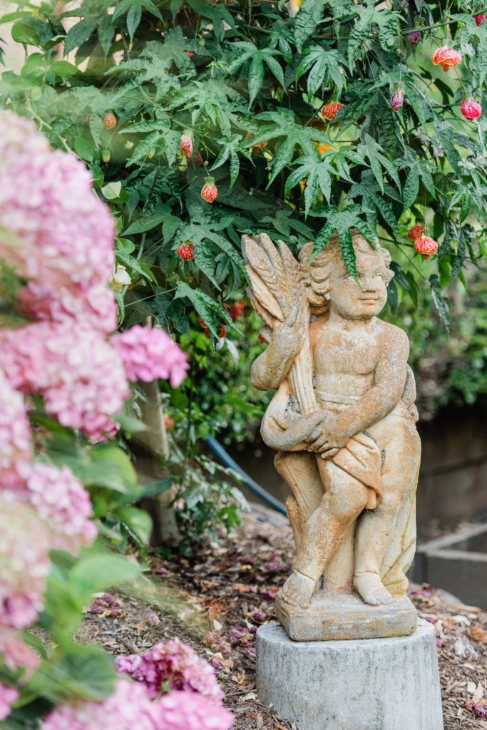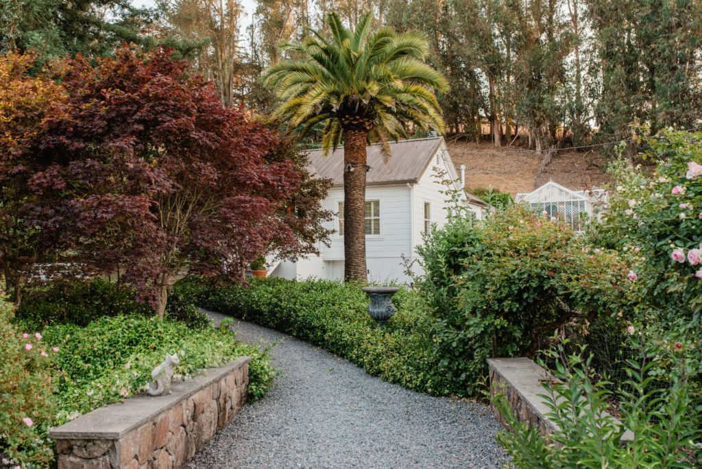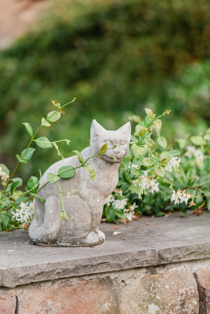 The main home, a little white cottage, now feels like a jewel box, surrounded by two acres of English country-style gardens with topiaries, boxwood hedges, seven fountains, and statuary — most charmingly, a series of ceramic cats. Exuberant color bursts out, with hydrangeas in the shade and climbing roses in the sun.