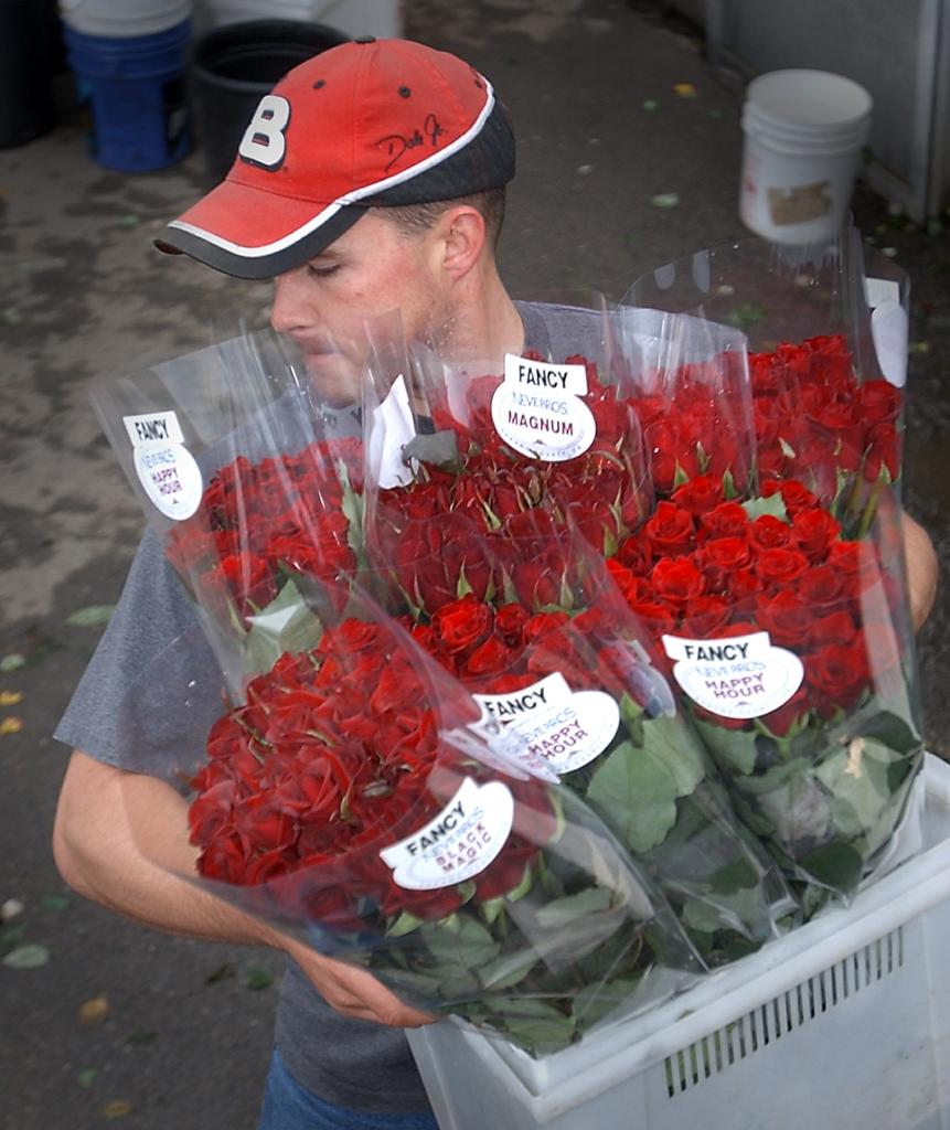 Nick Neve hauls a bucket of roses to his truck for delivery in Marin County from Neve Brothers, the family’s rose nursery in Petaluma, as they prepare for the Valentines Day rose-buying frenzy. (Photo by Mark Aronoff, file 2011)