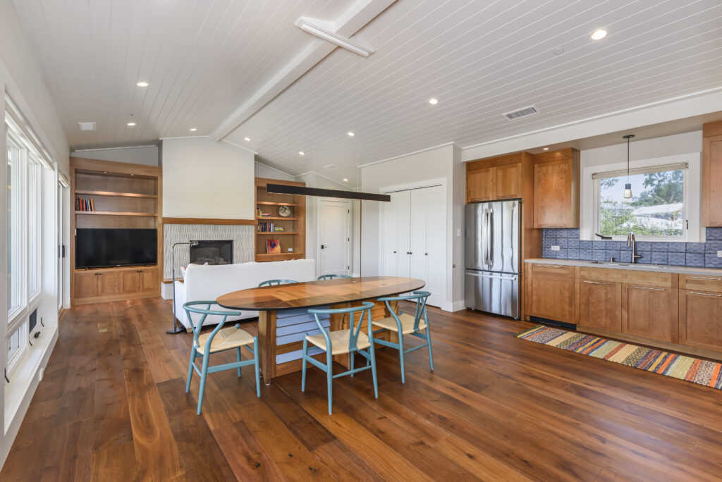An ADU sits on a second story above the garage offering panoramic views. The design elements are not an afterthought. Details like aqua-colored dining chairs and multi-colored textiles add vibrant color to the stained woods and white walls.