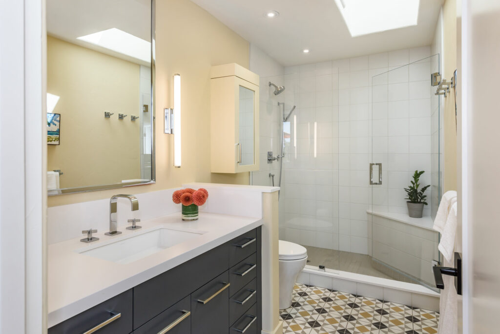 There are brilliant touches of bright color, too: deep blue tile in the ADU’s kitchen, orange umbrellas outside and a welcome sea-foam-colored paint in the bathroom (hello, ’90s). These elements come together to make an inspired and soothing environment.