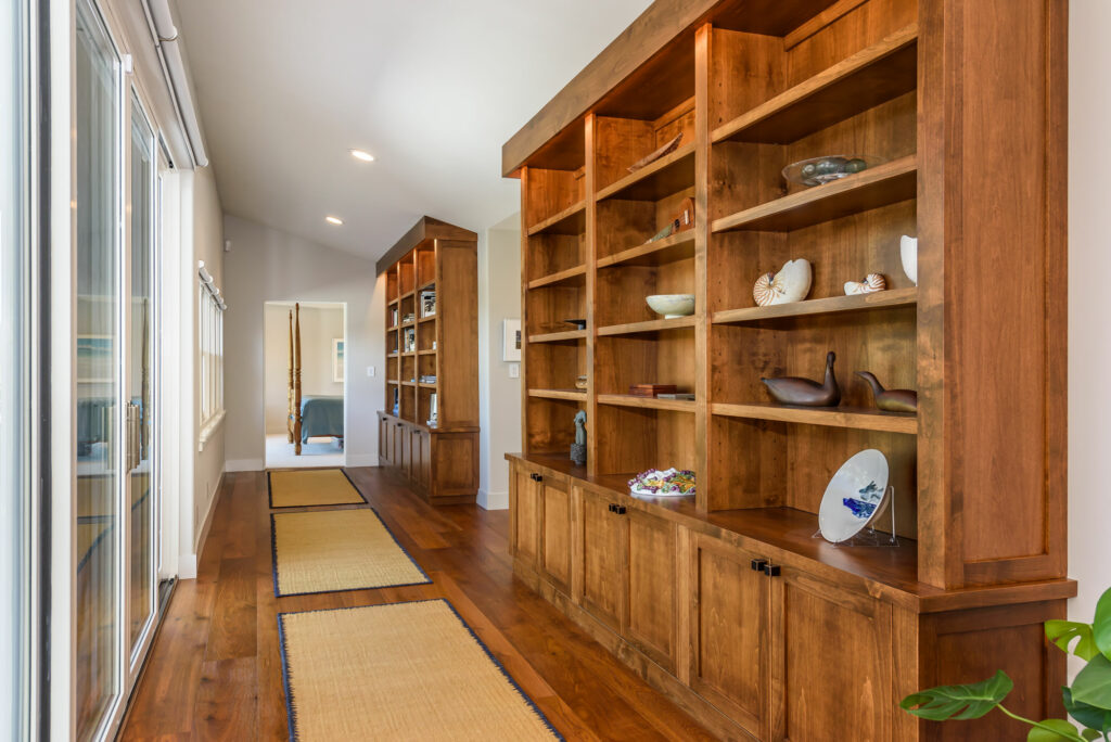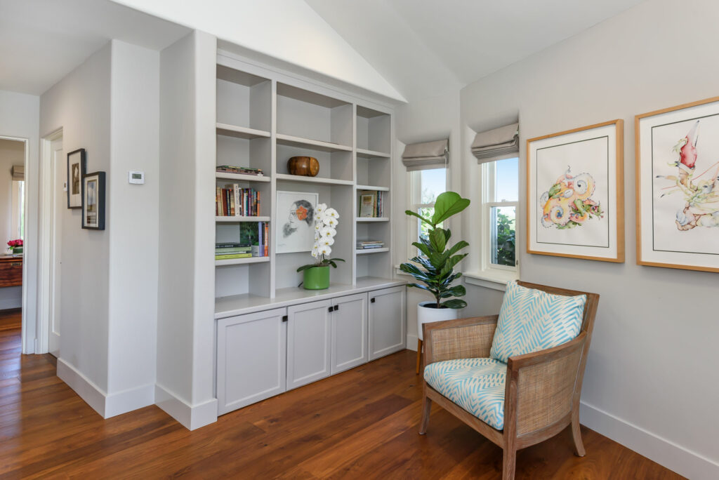 The home has a simple style with the ever-popular whited-out look to give off the calm feel people are craving in today’s busy and visually noisy world. But the tranquility-forward aesthetic has some rich color thrown in. Many stained wood elements are included, such as flooring, bookshelves, kitchen cabinets and furniture.