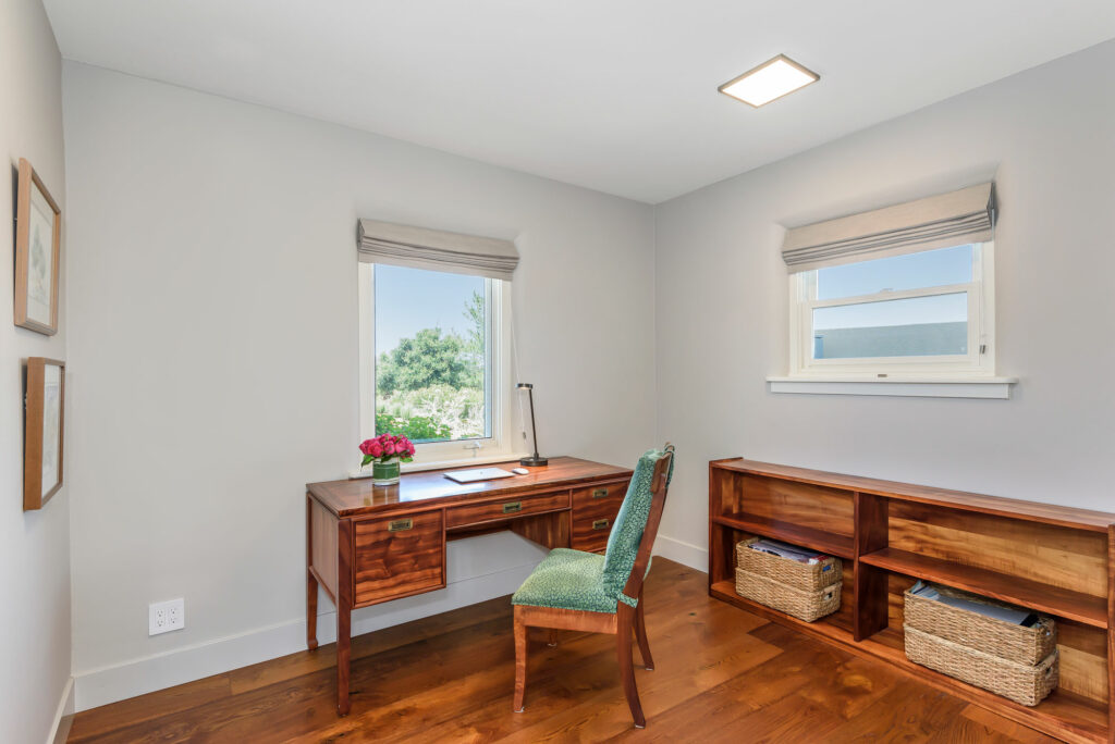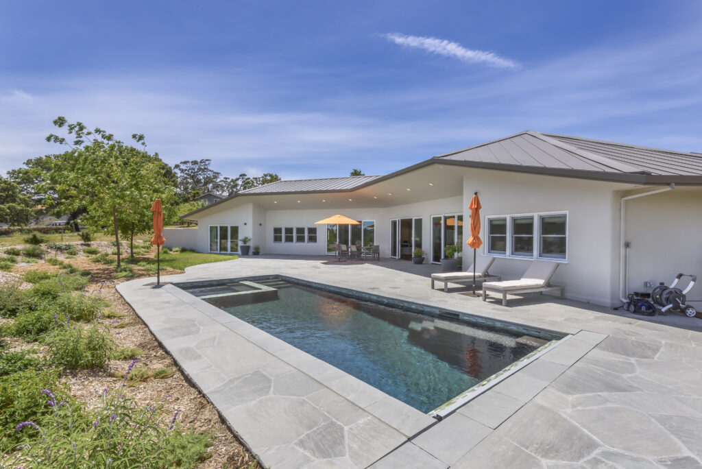 The sparse and tranquil vibes are carried outside to a simple rectangular pool and spa combo. The bottom of the pool is lined with pebbles that provide a sensory treat for world-weary feet. The black pebble bottom absorbs temperatures well, according to listing agent Rob Sullivan, allowing the pool to heat on its own. Plants grow separated in “islands” — a disciplined look that’s modern both visually and in terms of fire resistance.