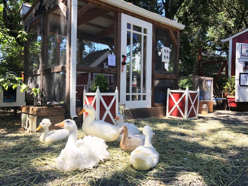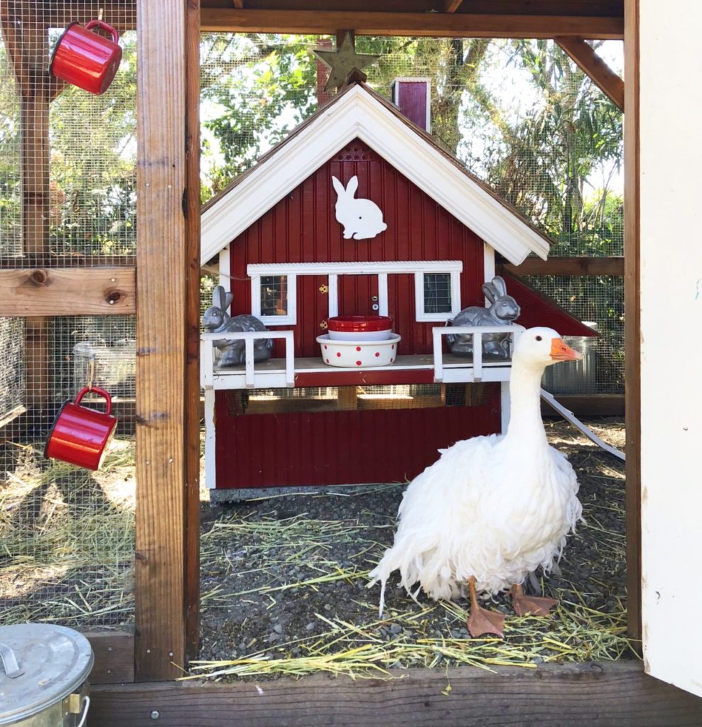 All of the structures are customized by Soderman, who takes basic frames or older coops and refurbishes them into charming homes for her animals. Everything from the sanding to the painting is done by hand, and she outsources only for heavy-duty items like roofing (for which she uses local vendors). The theme of red and white is consistent from the coops to the red and white roses to custom name plaques that indicate which animals are in the different coops.
