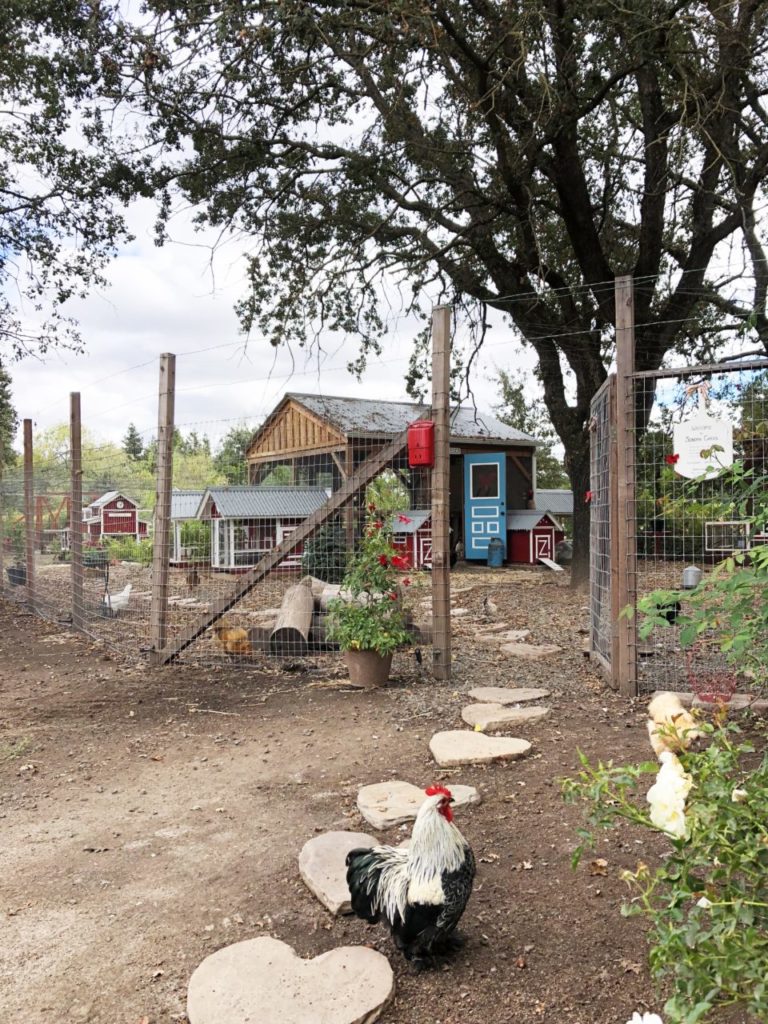 There is one large coop in the center of the yard, adorned with a vibrant barn door. Smaller coops built to look like small houses are attached to the central coop, with electric doors that automatically open for chickens to pass from the main areas to the specific nesting areas (each with a small, hand-painted name plaque for chickens incubating eggs).