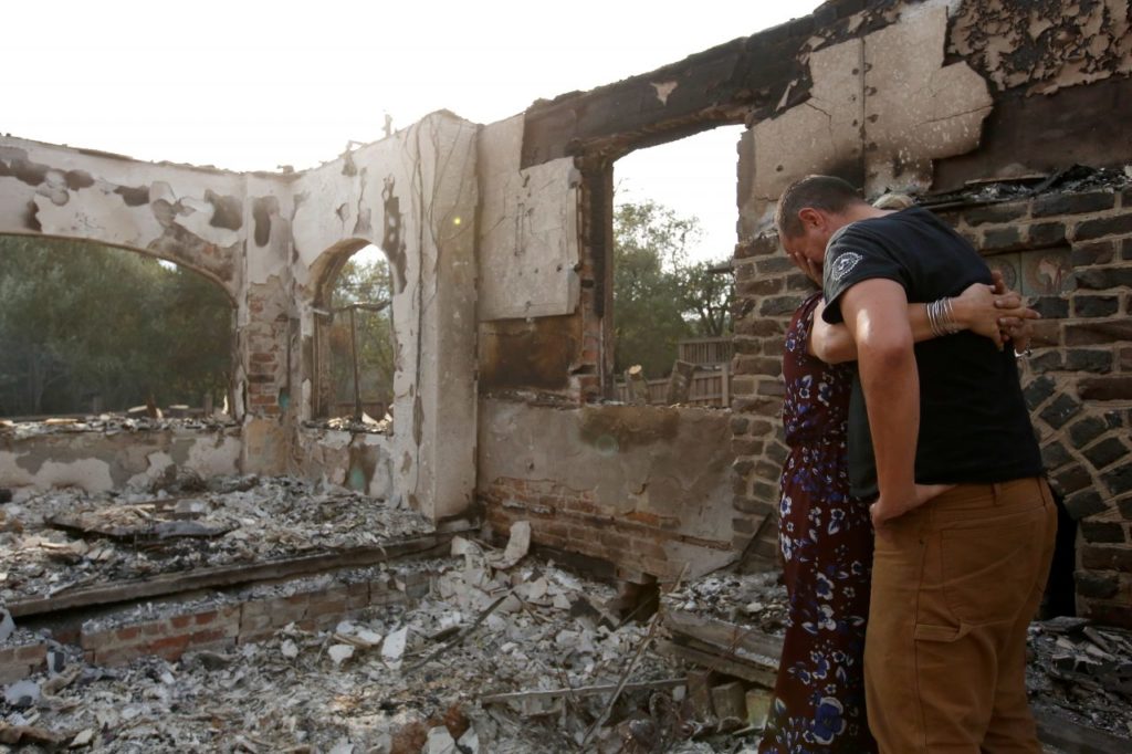 Overcome with emotion, Charles Lindner is embraced by his wife while they stand in the burned ruins of their home off Warm Springs Road in Glen Ellen on Tuesday, October 10, 2017, one day after the Nuns fire decimated their neighborhood. (Photo by Alvin Jornada)