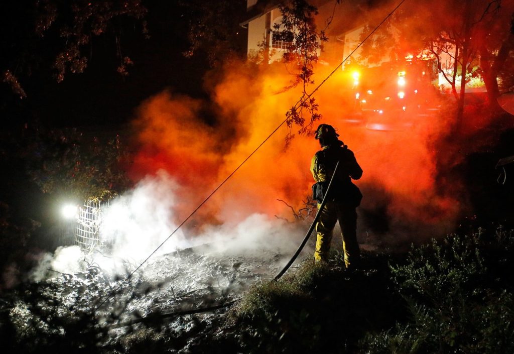 Kenwood firefighter Adrienne Uboldi works to contain the fire on Trail Ridge Place in the Oakmont area of Santa Rosa on Tuesday, October 10, 2017. (Photo by Beth Schlanker)