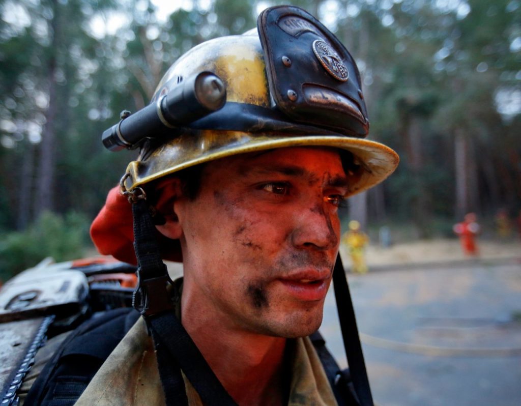 Long Beach firefighter Ernesto Torres looks out over a back fire operation at the Oakmont fire, off Highway 12 in Santa Rosa on Tuesday, October 17, 2017. (Photo by Alvin Jornada)