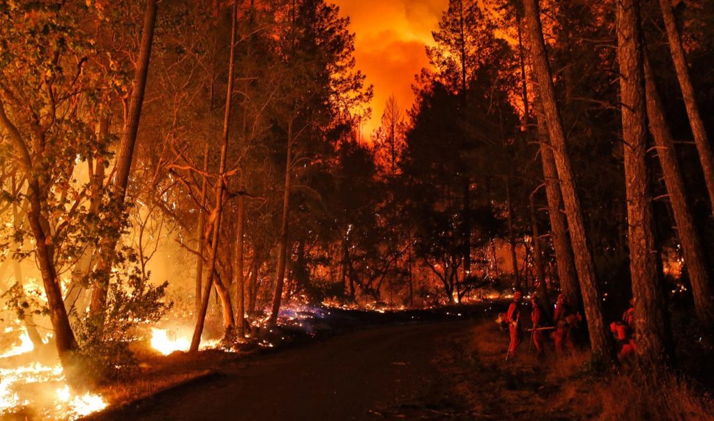 Inmates from Cal Fire Mt. Bullion Crew 2 keep lookout across the road from a back firing operation at the Oakmont fire off Highway 12 in Santa Rosa on Tuesday, October 17, 2017. (Photo by Alvin Jornada)