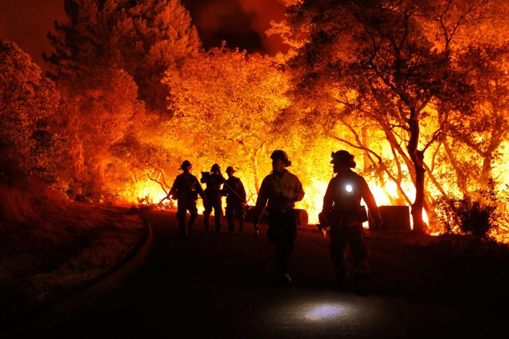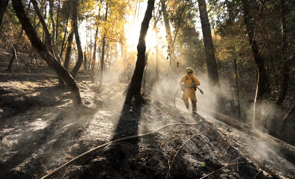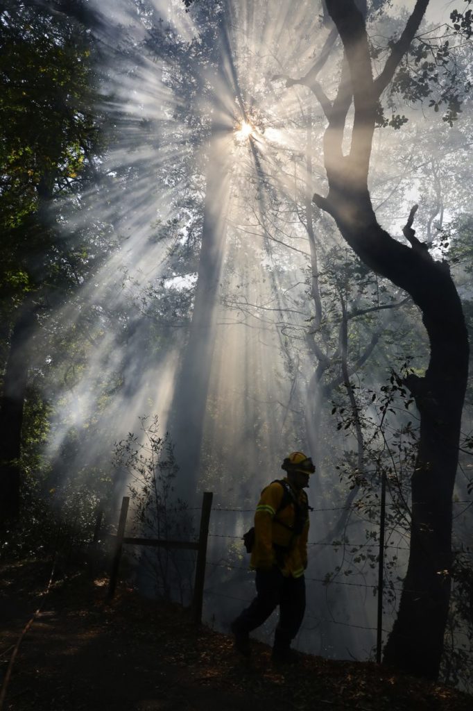 A San Diego Cal Fire firefighter monitors a flare up on the head of the Nuns fire above the Sonoma Valley on Wednesday, October 11, 2017. A wind shift caused flames to move quickly uphill and threatened homes in the area. (Photo by Kent Porter)