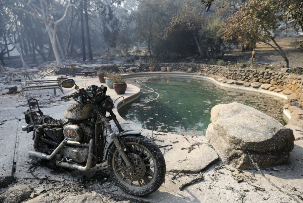 A motorcycle stands next to a pool of a home destroyed by fire on Bardy Road on Wednesday, October 11, 2017 in Santa Rosa. (Photo by Beth Schlanker)