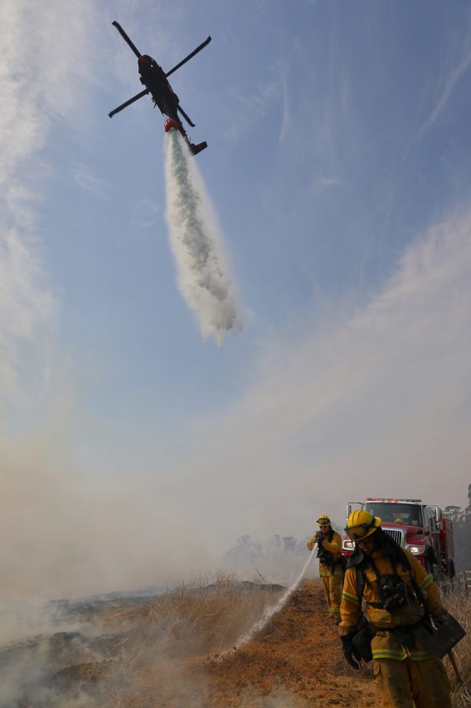 Rancho Adobe firefighters Ryan Rania, right, and Josh Giammona lay down a wet line, as a helicopter makes a water drop to protect a property along Crane Canyon Road, near Alta Monte Drive, east of Rohnert Park on Wednesday, October 11, 2017. (Photo by Christopher Chung)