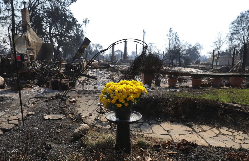 A pot of flowers left in front of a home in the burned Coffey Park neighborhood of Santa Rosa add color to an otherwise gray landscape, on Wednesday, October 18, 2017. (Photo by Christopher Chung)