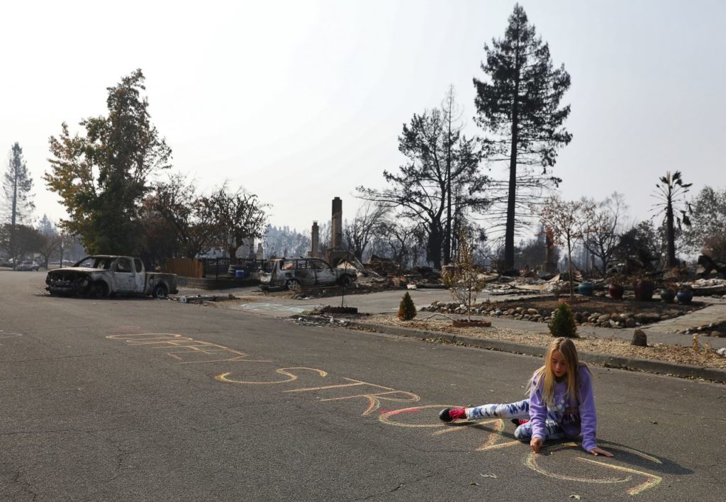 Jenna Gant, 10, writes "Coffey Strong" in chalk along Dogwood Drive, in the Coffey Park neighborhood of Santa Rosa on Wednesday, October 18, 2017. Gant lives with her grandmother, Kathy Anton, on the east side of Dogwood Drive, whose home was spared from the fire. (Photo by Christopher Chung)