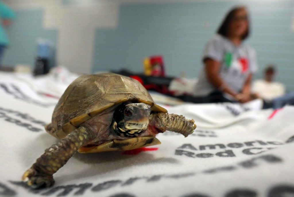 Liz Perez gathered her most important possessions, including her 35-year-old box turtle Phyllis, when she was evacuated from her Santa Rosa home on Brush Creek. Luckily she could stay with her turtle at the small animal shelter at the Sonoma County Fairgrounds. (Photo by John Burgess)