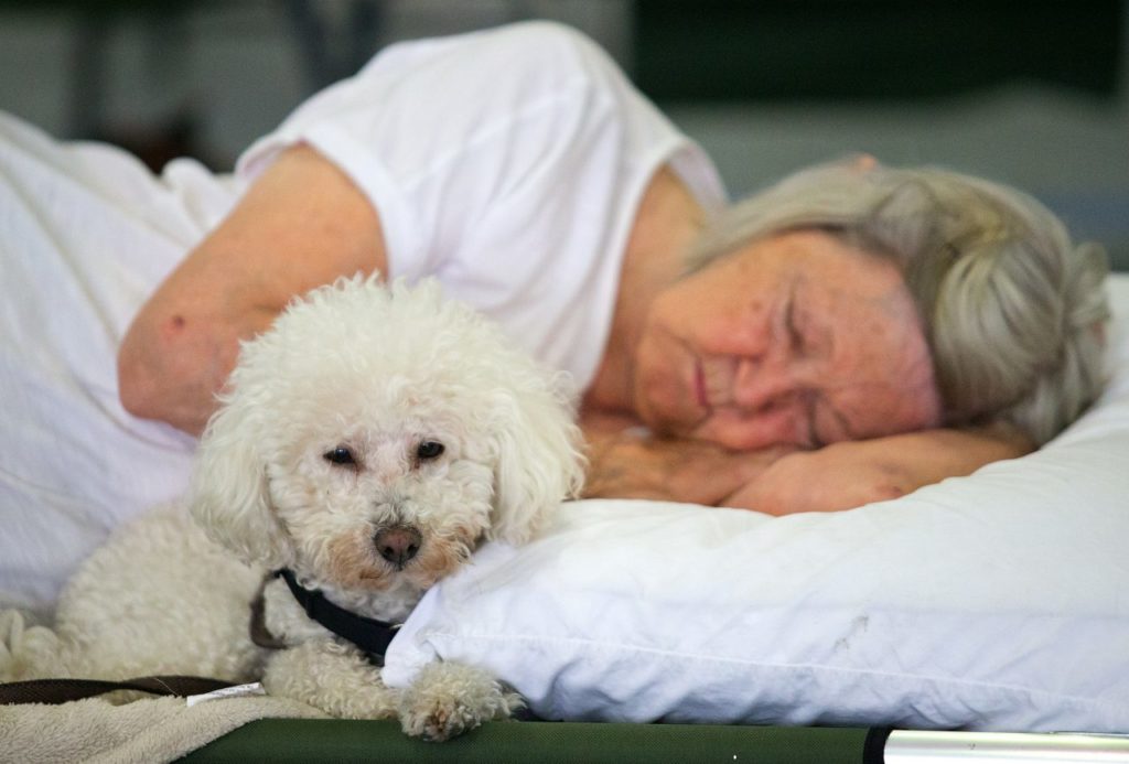 Valerie Robinson naps with Abby at the small animal shelter at the Sonoma County Fairgrounds. They were evacuated from Rincon Valley. (Photo by John Burgess)