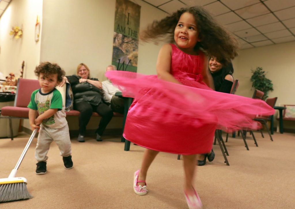 Cymone Weddington, right, watches her daughter Jazzmariah, 4, spin in her princess dress while her son Noahmiah, 22 months, sweeps at a pop-up shelter at the Calvary Chapel of Santa Rosa. Weddington and her family evacuated from the Extended Stay Hotel on Mendocino Avenue. (Photo by John Burgess)