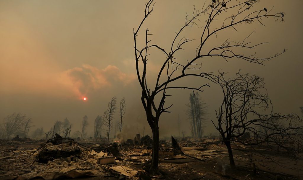 Sunrise turns the smoke an eerie color at Coffey Park in Santa Rosa, on Monday, October 9, 2017. (Photo by Kent Porter)