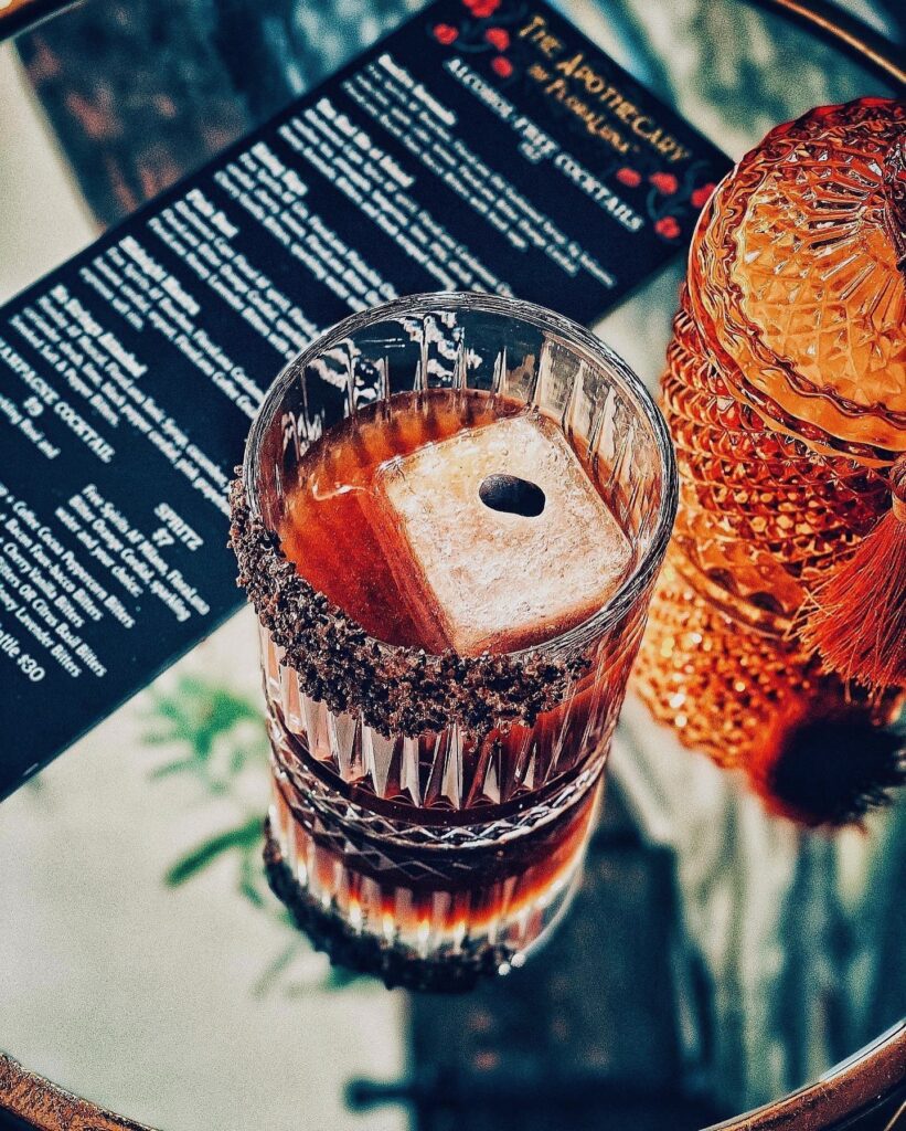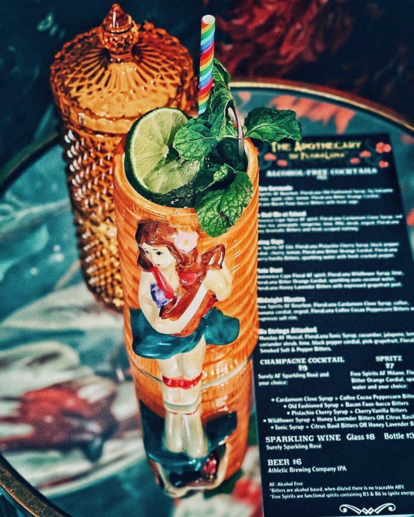 Achor arrived at eight cocktails for The Apothecary’s opening menu, including No Strings Attached — a blend of alcohol-free mezcal, tonic syrup, lemon coriander shrub, jalapeño and smoked bitters — and Midnight Mantra, made with nonalcoholic bourbon, cardamom clove syrup, coffee banana cordial and coffee cocoa peppercorn bitters. All selections are priced at $12.