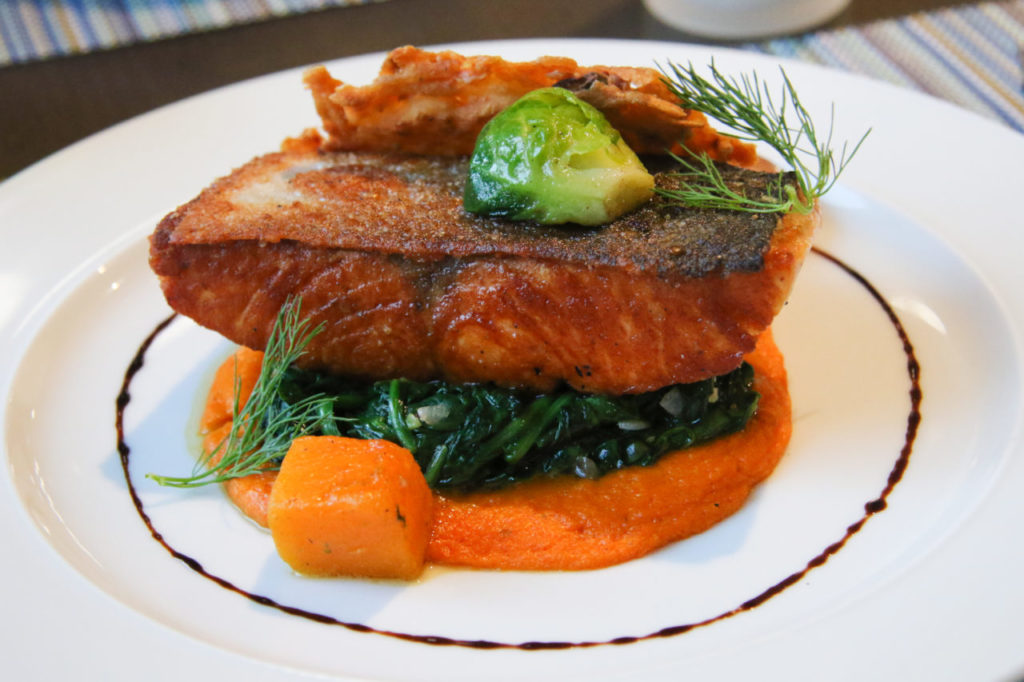 “Food has to taste good first,” Karkus says, “and look good second.” He’s achieved both, with perfectly cooked greens and beans, clever touches like balsamic “pearls” (a molecular gastronomy technique) that aren’t overly precious, deeply flavorful infusions of spices and herbs, and perfectly crisp salmon and duck skin.