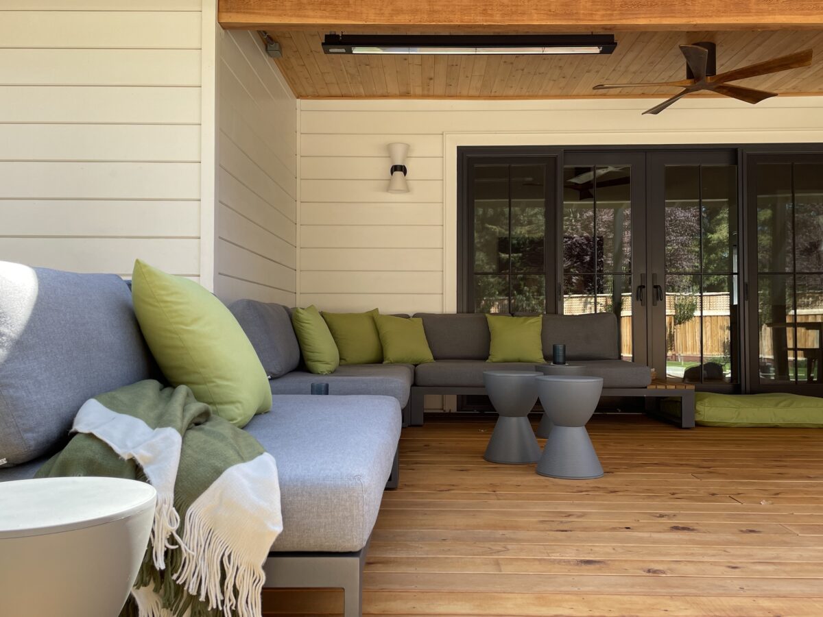 Double doors open to an Alaskan yellow cedar deck that overlooks the pool, which is accented by a trio of black fountains. Water pouring into the pool creates a relaxing ambient sound, while the raised deck provides a view of the vineyards just beyond the fence. A steel-framed pergola offers shade in the summer and heaters in the eaves take care of cool nights.
