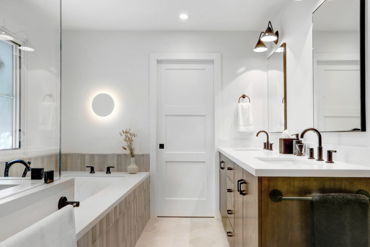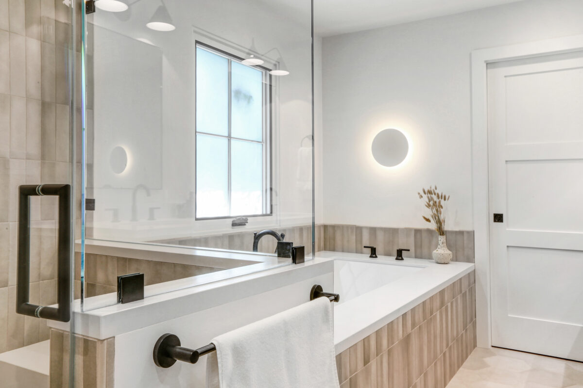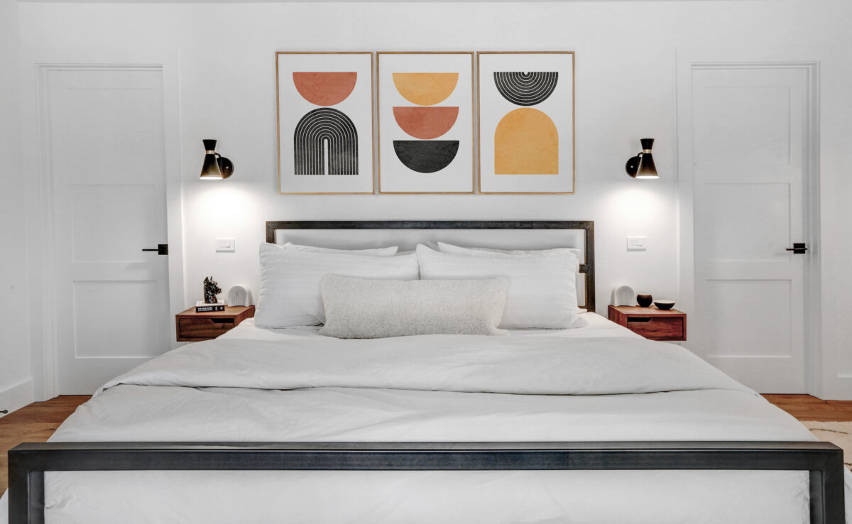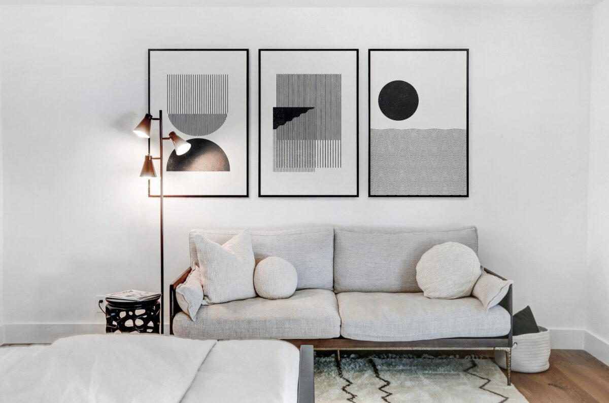Modern detailing—like angular bronze fixtures and Makoto Kumo Gray tiles in the bathroom—shine in the new living space. A few contemporary paintings, plus a view of the outdoors, take the focus, while geometric and faintly colored textiles enhance the modern aesthetic.