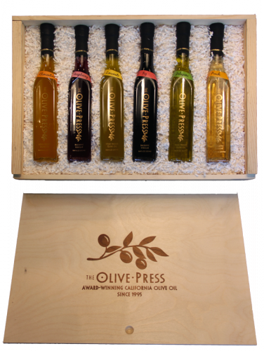 Flavored Balsamics and Oils: A combination for use as marinades, dipping oils, salad dressings or even to top ice cream. Includes one 250 ml bottle of each of the following: Clementine Olive Oil, Raspberry Balsamic Vinegar, Limonato Olive Oil, Fig Balsamic Vinegar, Jalapeño Olive Oil, Peach Balsamic Vinegar. $121, The Olive Press, theolivepress.com