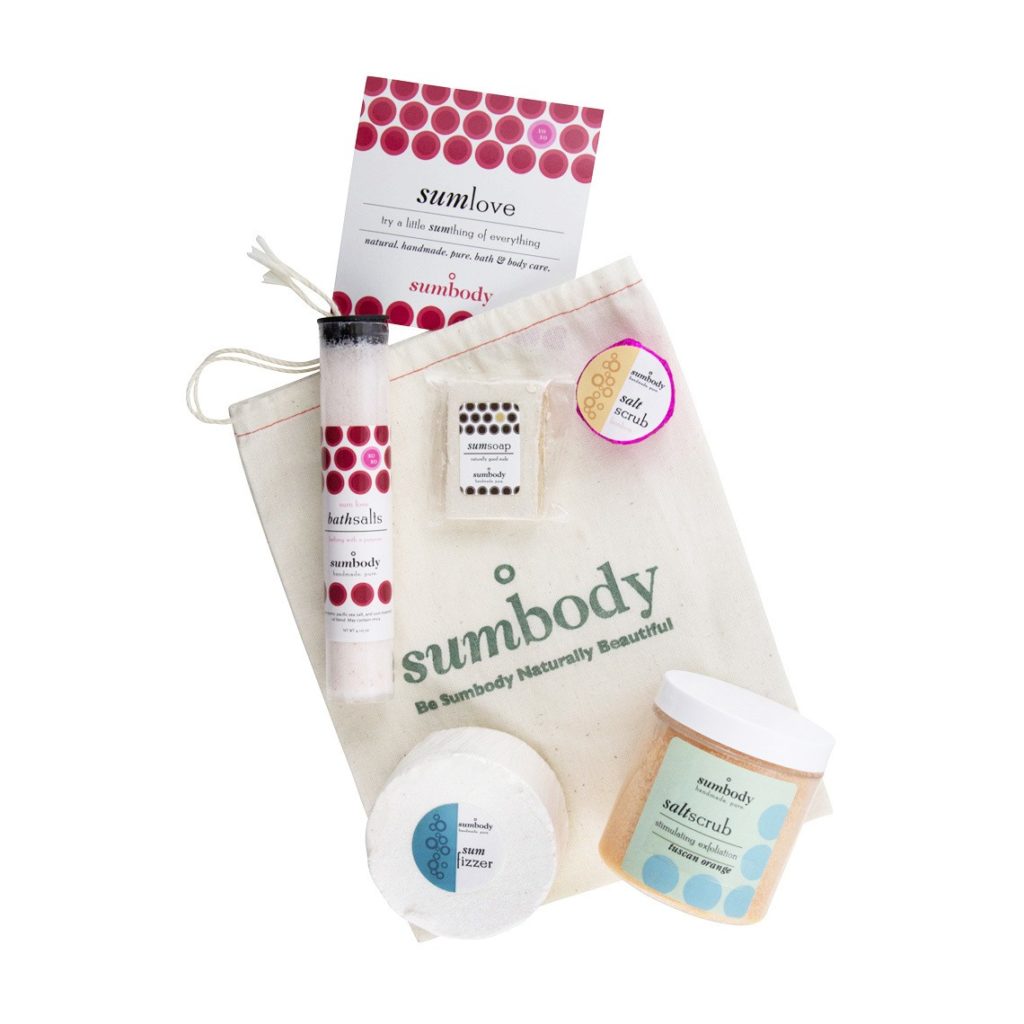 Soothing Spa Products: Sebastopol's Sum Body strives to make their products "100% kind to your body and to the Earth." This assortment includes: small body scrub, fizzer, soap, bath salt tube, and a salt scrub bonbon. $39, sumbody.com