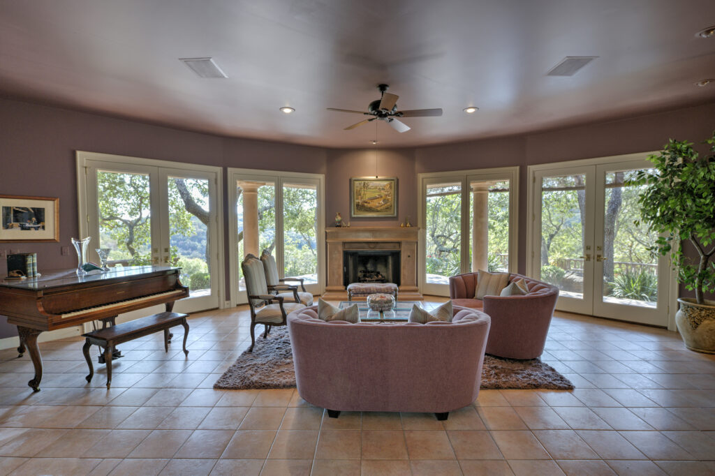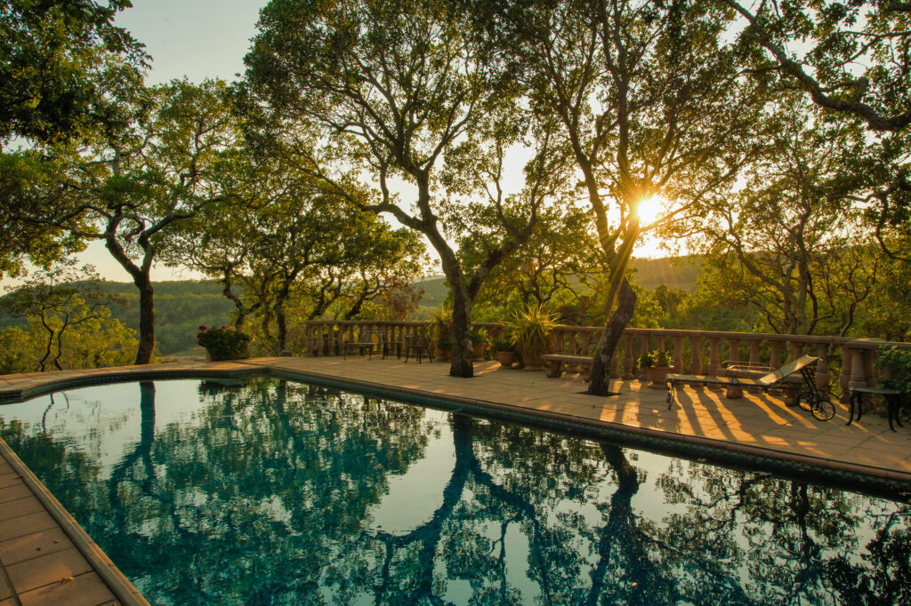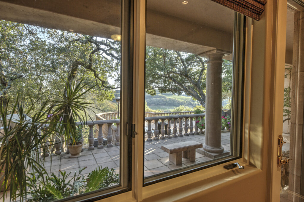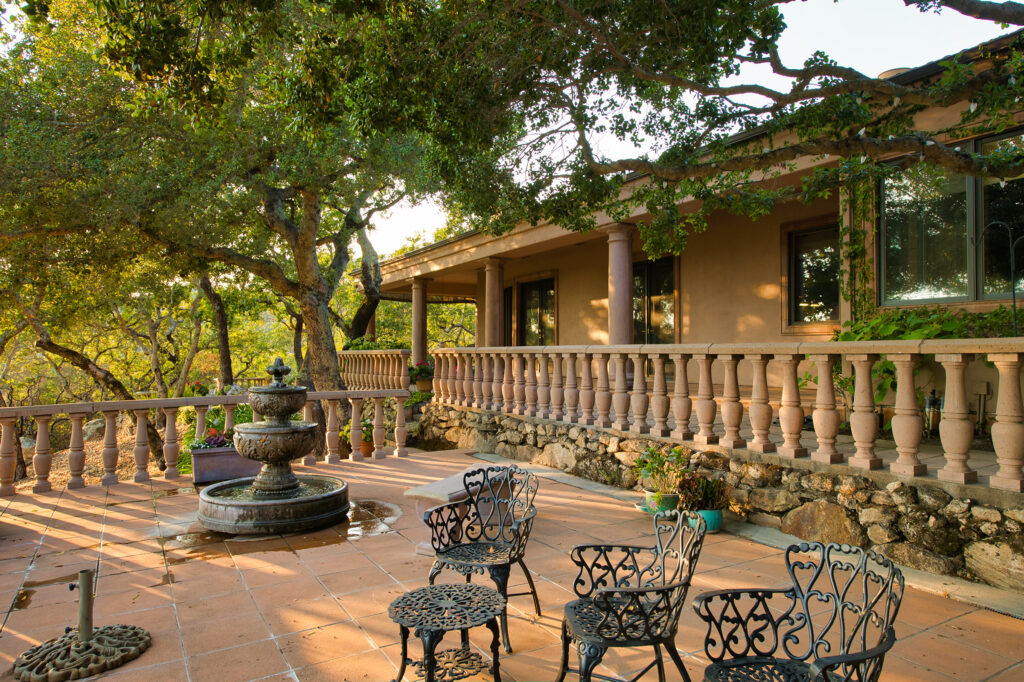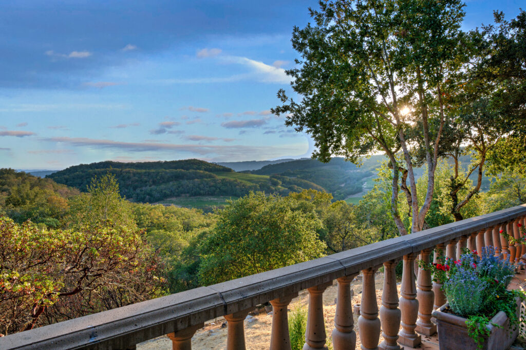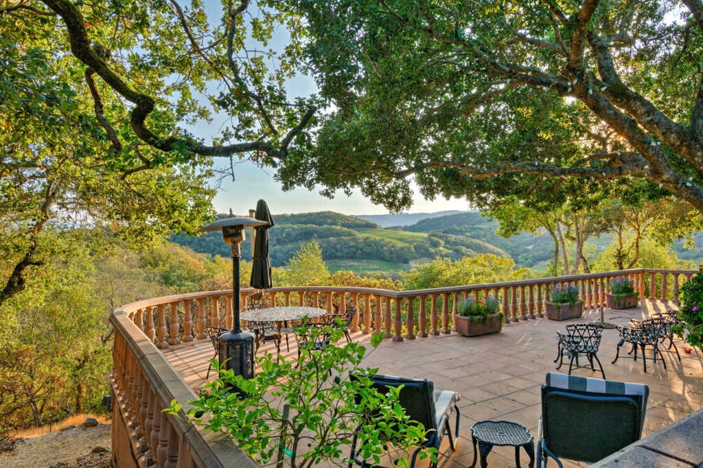 A rounded terrace with balusters wraps around the back of the home, creating a spot to barbecue, lounge or just enjoy the top-of-the-world views of distant hills and vineyards. A simply-designed pool overlooks the valley, through some framing by majestic oak trees.