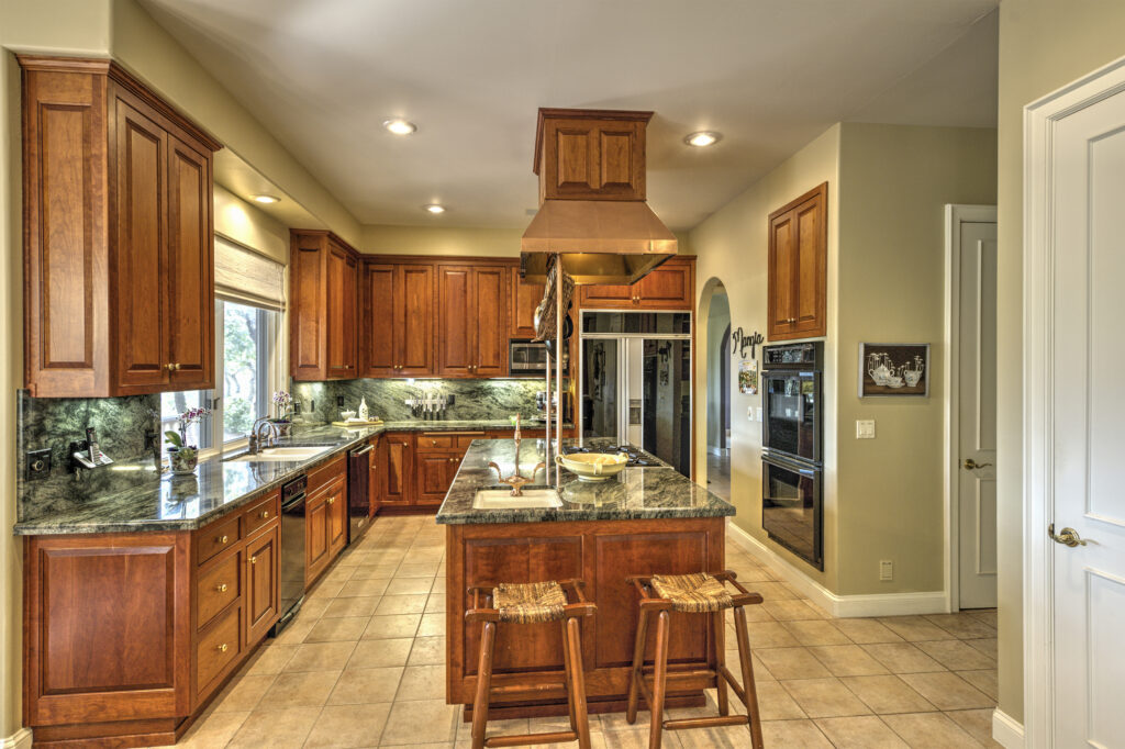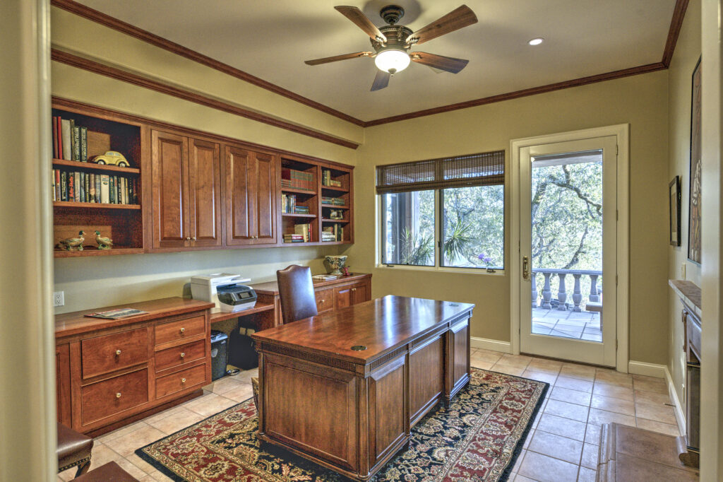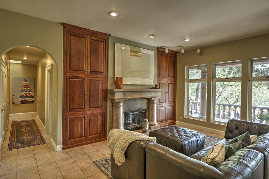 The 4,000-square-foot home is situated on a 14-acre lot just a mile into the hills from the Sonoma Ranch entrance on Seventh Street, which, in turn, is only a mile and a half from the historic Sonoma plaza. In addition to three bedrooms, the expansive layout includes three full bathrooms, a formal dining room, an eat-in kitchen, a large living room and an office. All rooms are spacious with beveled stained wood cabinets that add warmth to the rooms and provide plenty of storage. There are three gas fireplaces in the home and every room has spectacular views.