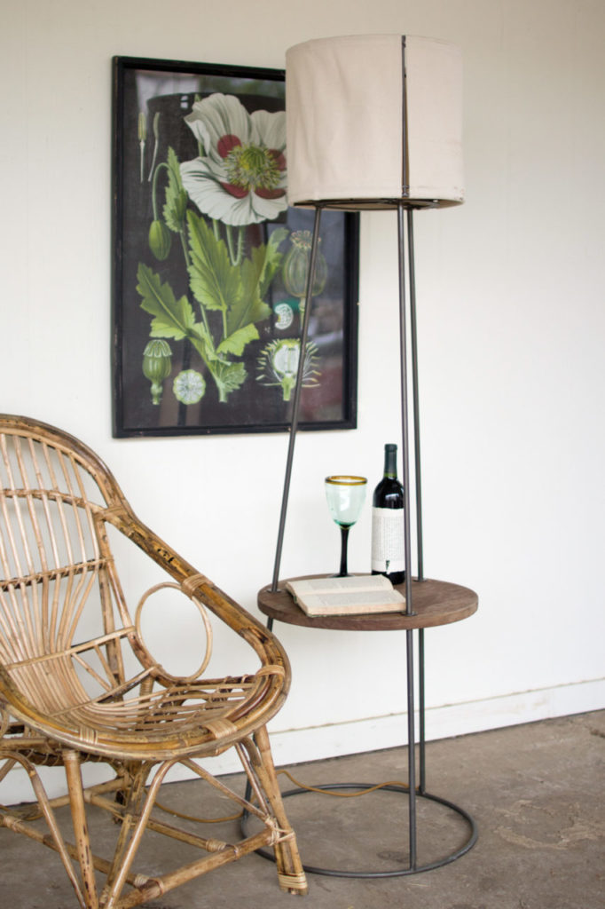 (Multi)Task Lighting: Real estate is expensive. Have your light and table share one space-saving footprint with this ingenious piece. A canvas shade sits atop an iron base and wood tabletop.