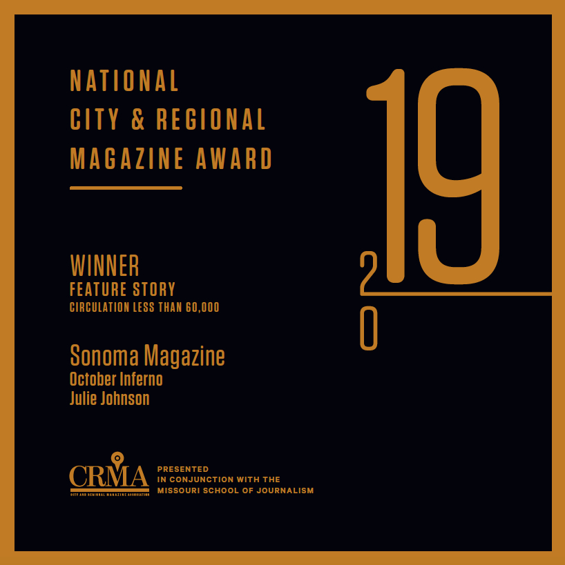“Wrapped in a package that is stunning and beautiful, Sonoma [magazine] is a top-notch regional magazine that exudes local know-how. Visual features sit comfortably alongside reader service stories, and these attributes came together in extraordinary fashion in a special issue about the area’s wildfires.”