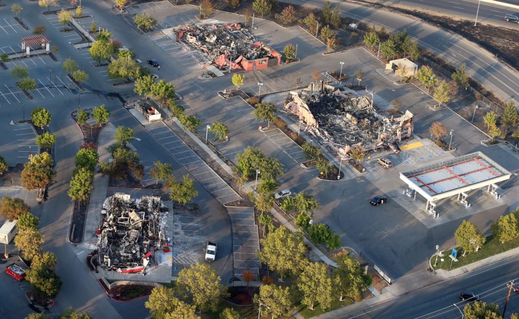After: Fire destroyed the Arby's, left, McDonald's, right and Applebee's on Hopper Lane in Santa Rosa. (Photo by John Burgess)