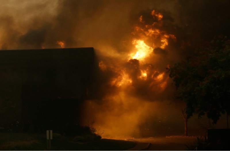 The sun shines behind a burning building at the Hilton Sonoma Wine Country Hotel in Santa Rosa, Monday, Oct. 9, 2017. (AP Photo/Jeff Chiu)