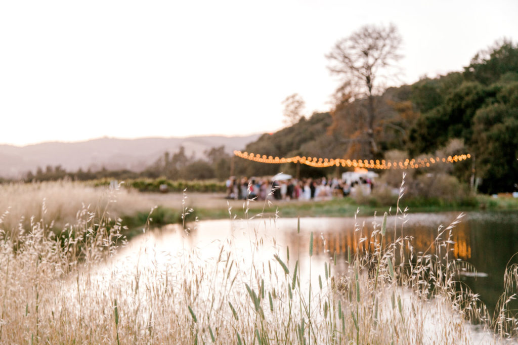 A string of light surrounds the celebration area next to the pond at Gundlach Bunschu. (Photo courtesy of Kathryn White Photography)
