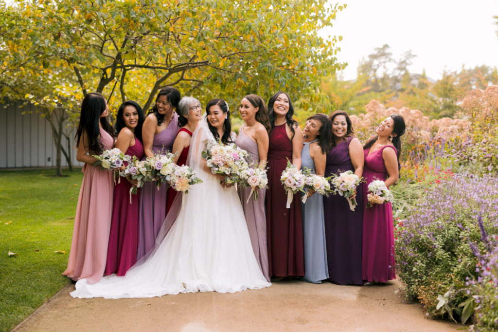Palette of Pretty: "It's not very common anymore to see all the ladies wearing the same thing," says Heather Gillis of Sonoma-based Quintana Events. "There's also more mixing in terms of having guys on the bride's side and vice versa. Uneven bridal party numbers are trending as well!" (Photo courtesy of Emily Jean Images)